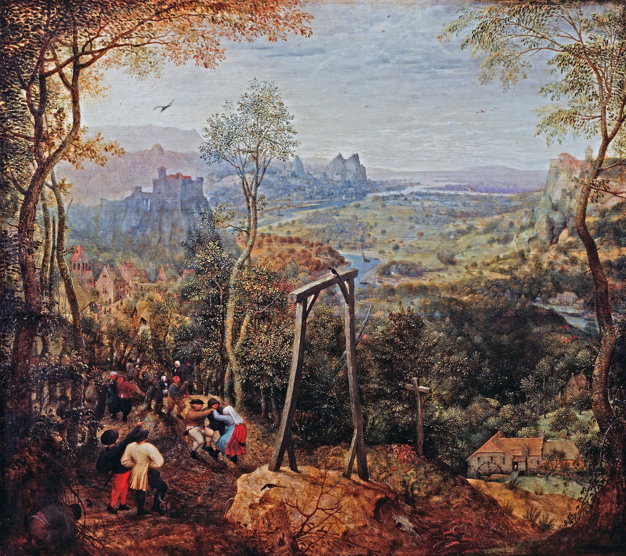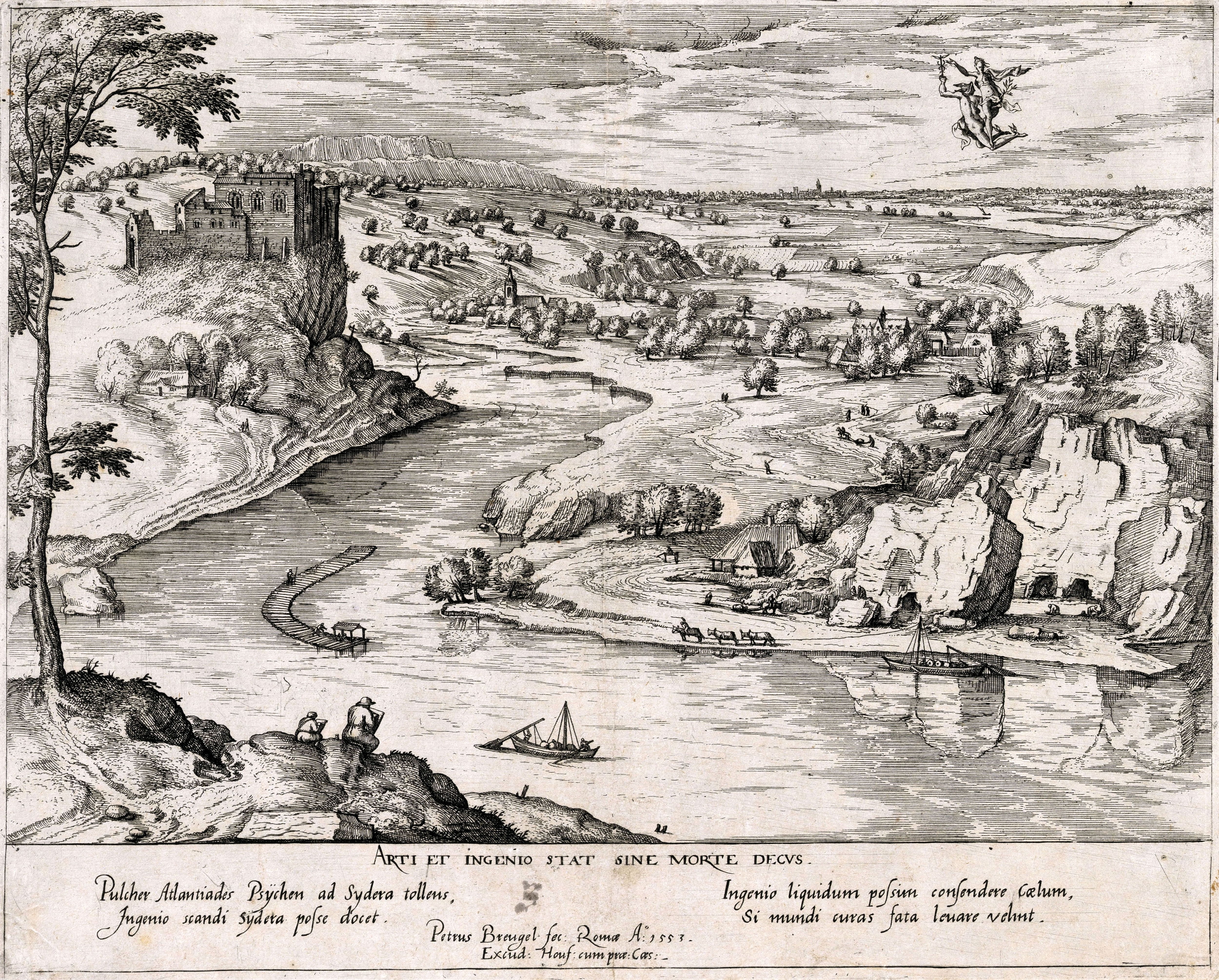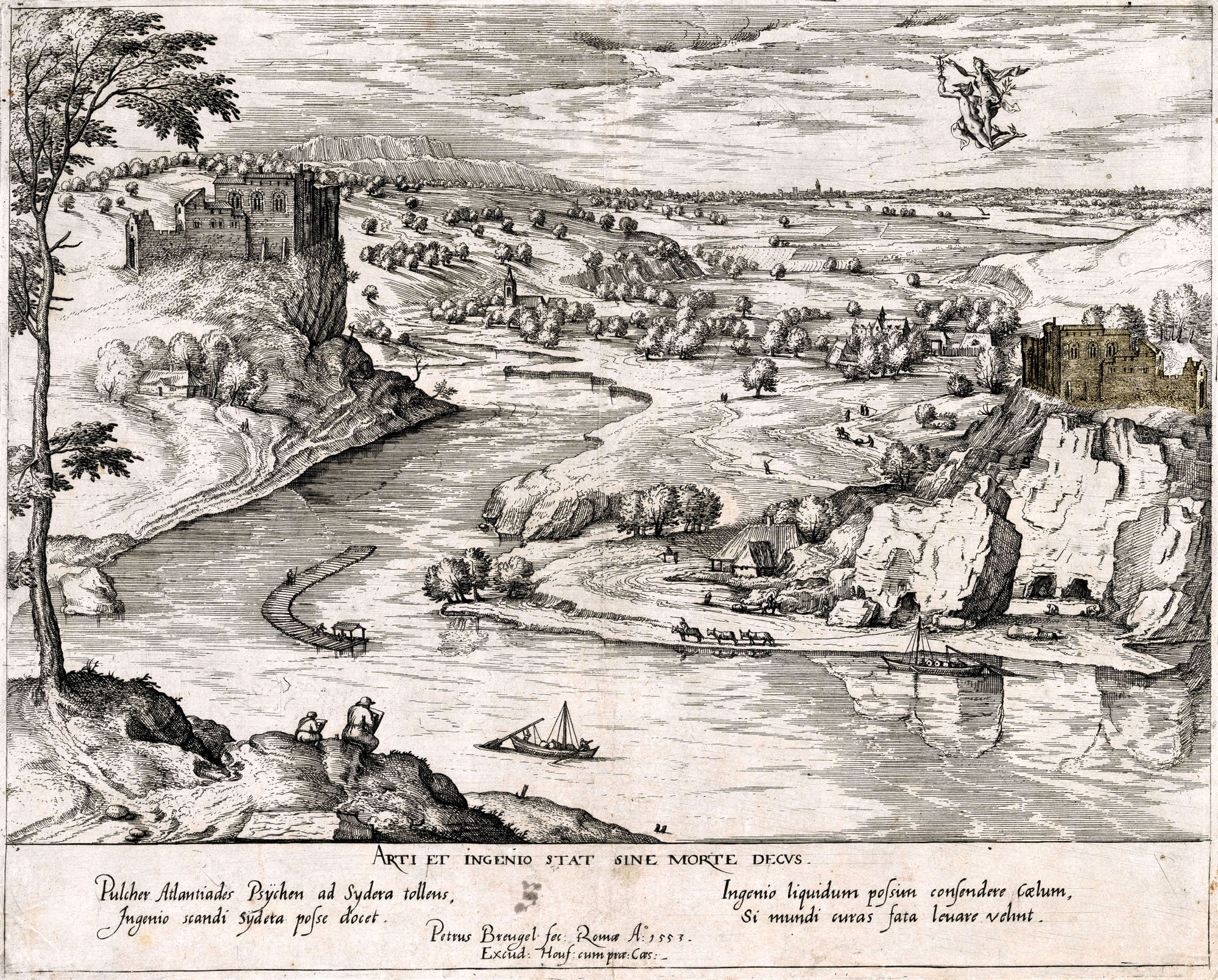 Dans la gravure de « Mercure et Psyché », nous constatons que les éléments du paysage ont été scindés et placés en miroir sur les deux rives opposées. Cette vision se rapproche de La pie sur le gibet de Bruegel