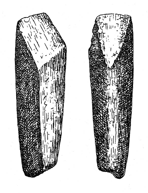 L'autre bloc, figure 8, n° 1, est en mauvais état; en le nettoyant, la surface polie s'écaillait dans la main tant la matière première était devenue friable. Il s'agit, en effet, d'un calcaire fortement altéré. La constatation d'une roche de ce genre est un fait inédit et remarquable, car son peu de dureté relative est, sans aucun doute, en rapport avec la destination de l'outil. Poids: 0 kg 043.